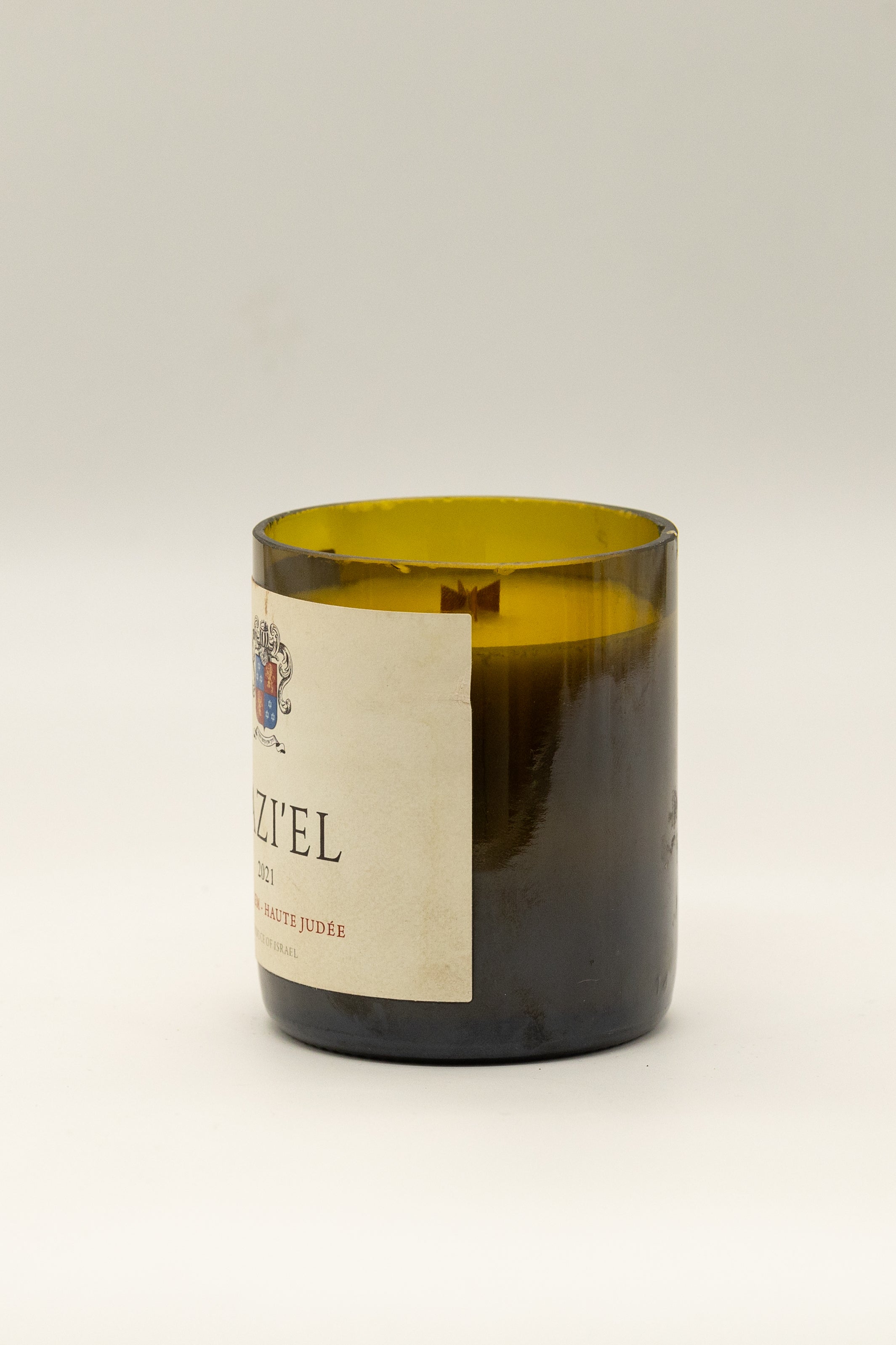 בקבוק יין ממוחזר של יקב Razi’el – פריט עיצובי ייחודי.